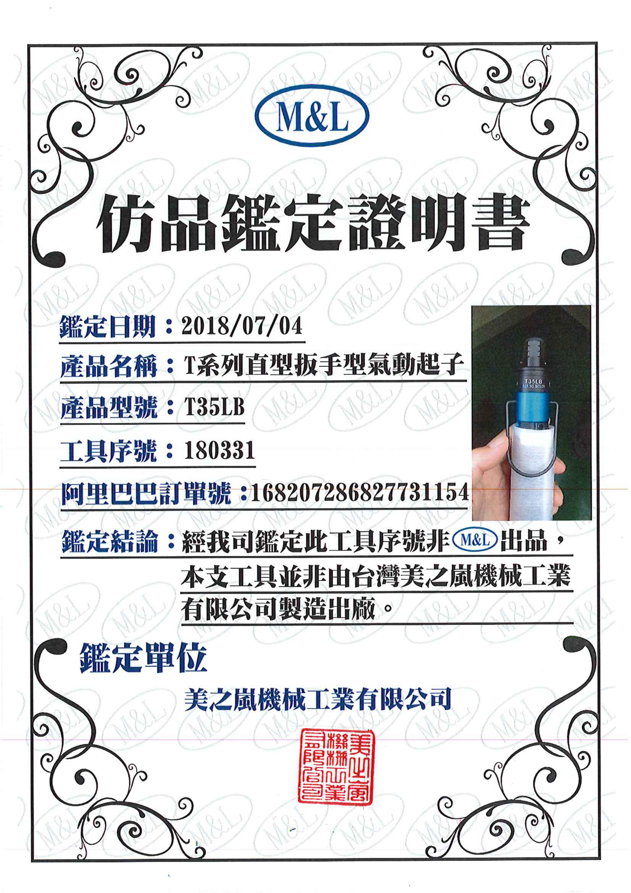 في الآونة الأخيرة، تلقت شركة M&L Meizhilan Machinery Industry Co., Ltd. خطابًا من أحد العملاء للتحقق من أداة T-LB التي تم شراؤها من البر الرئيسي للصين. أبلغ العميل الشركة التي تبيع هذه الأداة بأنها أصلية وتم شحنها من المصنع الأصلي. ومع ذلك، تحققت شركتنا من أن الرقم التسلسلي للأداة الذي قدمه العميل لم يتم إنتاجه بواسطة M&L. لم يتم تصنيع هذه الأداة من قبل شركة Meizhilan Machinery Industry Co., Ltd. التايوانية [الصورة المرفقة توضح شهادة التعريف المزورة المقدمة من M&L]